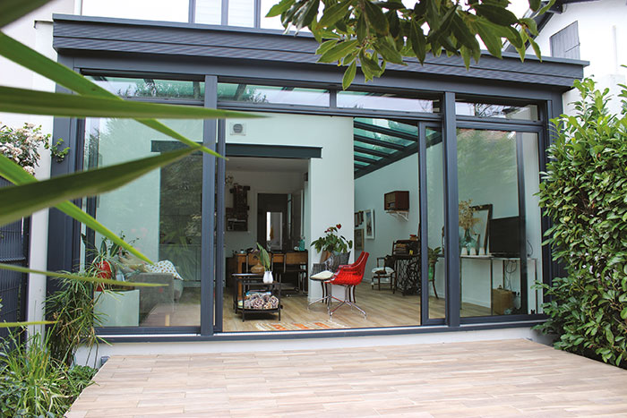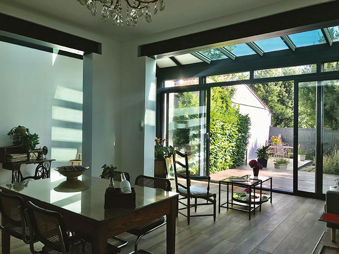 Côté jardin, la véranda compte 4 vantaux pour une longueur totale de 5,60m, qui correspond peu ou prou à la largeur de la parcelle. L’ouverture centrale coulisse sur les deux fixes latéraux offrant un passage de 2,80m. Profonde de 3m, elle développe une nouvelle pièce à vivre que les IPN dans les ouvertures rendent très ouverte tant à l’intérieur de la maison qu’à l’extérieur. Sur les côtés, la véranda s’appuie sur les murs mitoyens qui montaient à 2,80m.