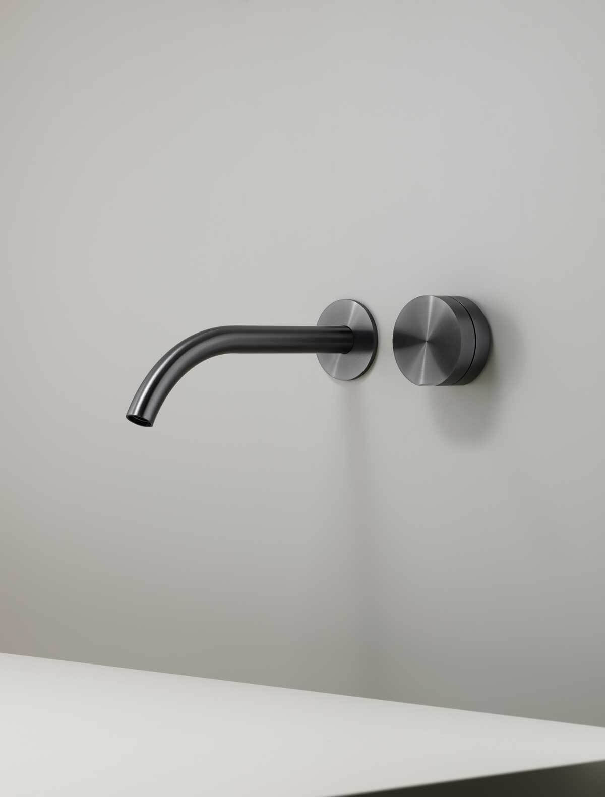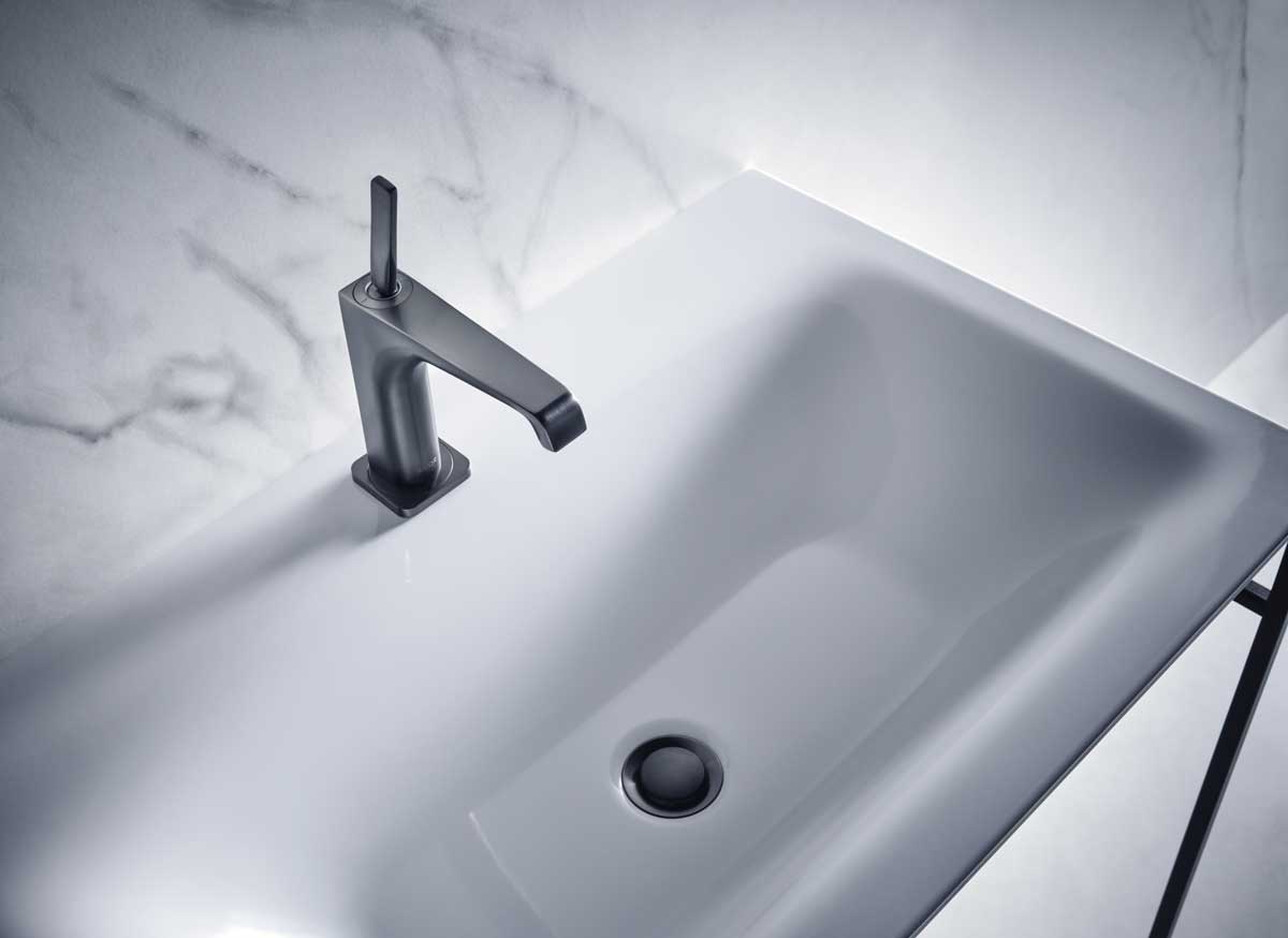La gamme de robinets en acier inoxydable CEAdesign Giotto est inspirée des formes pures. Le bec et la plaque de recouvrement sont également en acier inoxydable satiné, poli et en diamant noir. Design Natalino Malasorti.