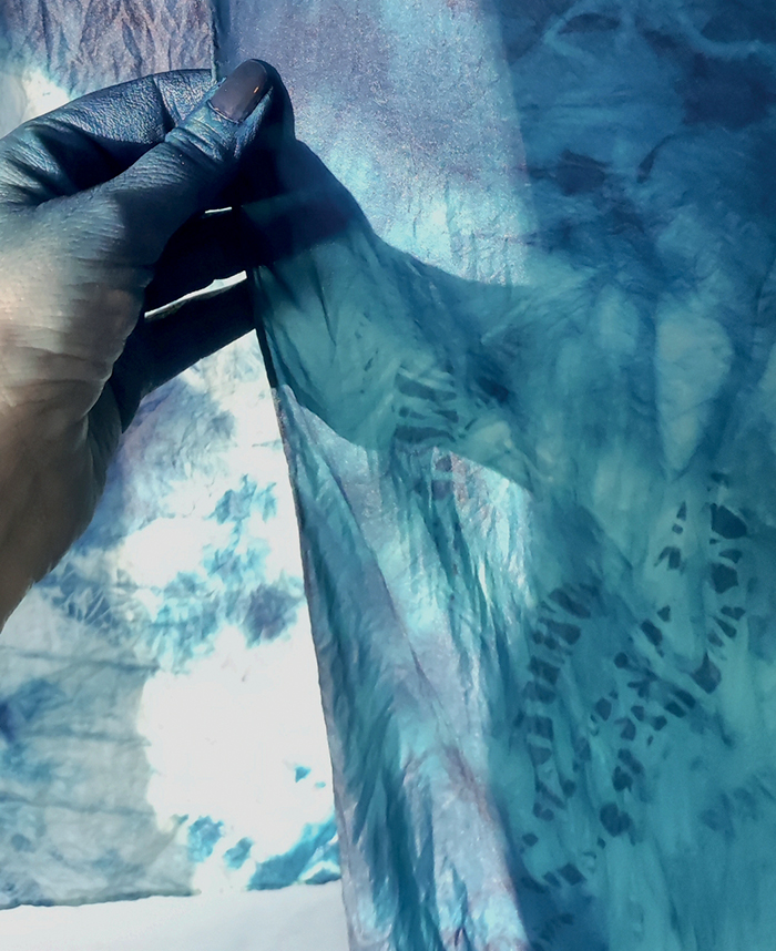 aux autres couleurs. L’aspect tactile et le rapport direct à la matière éveillent les sens : l’odeur, la texture, la vue et même une dimension auditive, qu’elle décrit comme la musique du tissu. « Les gouttes tombent dans la cuve à des rythmes différents selon les pliages ou les ligatures réalisés et ne produisent pas le même son. »