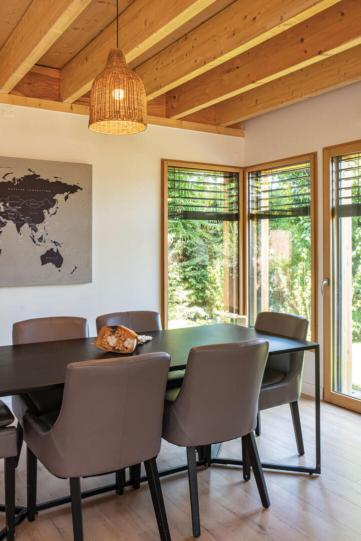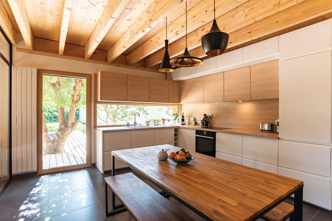 laurence roques architecte tournefeuilleSalle à manger dedans dehors. Une table métallisée AM-PM et l’ensemble de chaises couleur taupe de l’enseigne Made contrastent avec l’épicéa massif de la sous-face du plancher bois collaborant du premier étage. Le sol stratifié provient de chez Saint Maclou et la suspension de Leroy Merlin.