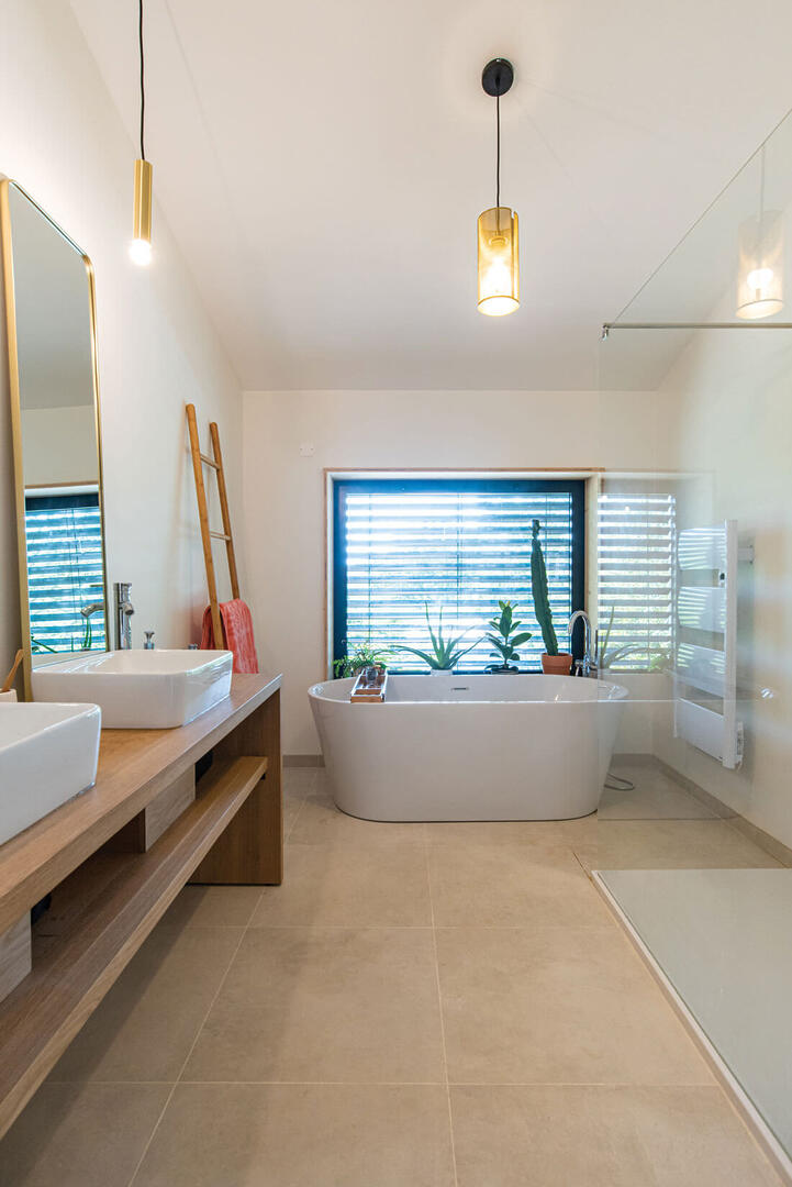 laurence roques architecte tournefeuilleSalle de bains lumineuse. La douche, la baignoire et les vasques proviennent de l’enseigne Leroy Merlin. Quelques touches de couleurs viennent se dissocier de la pièce très claire à l’image du carrelage grès cérame de chez Décocéram (Portet-sur-Garonne) et du meuble en chêne massif sur-mesure.