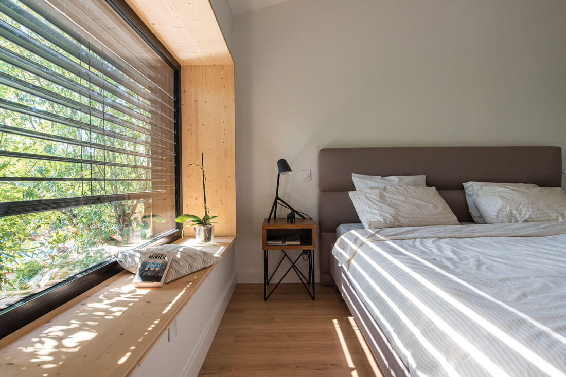 Pour l’orientation de la maison, Laurence Roques l’a tournée vers l’ouest pour profiter au mieux du jardin et de la vue. « J’ai relevé les enjeux climatiques malgré cette orientation. Le contrôle des apports solaires permet de très peu chauffer en hiver et de se passer de climatisation en été. »