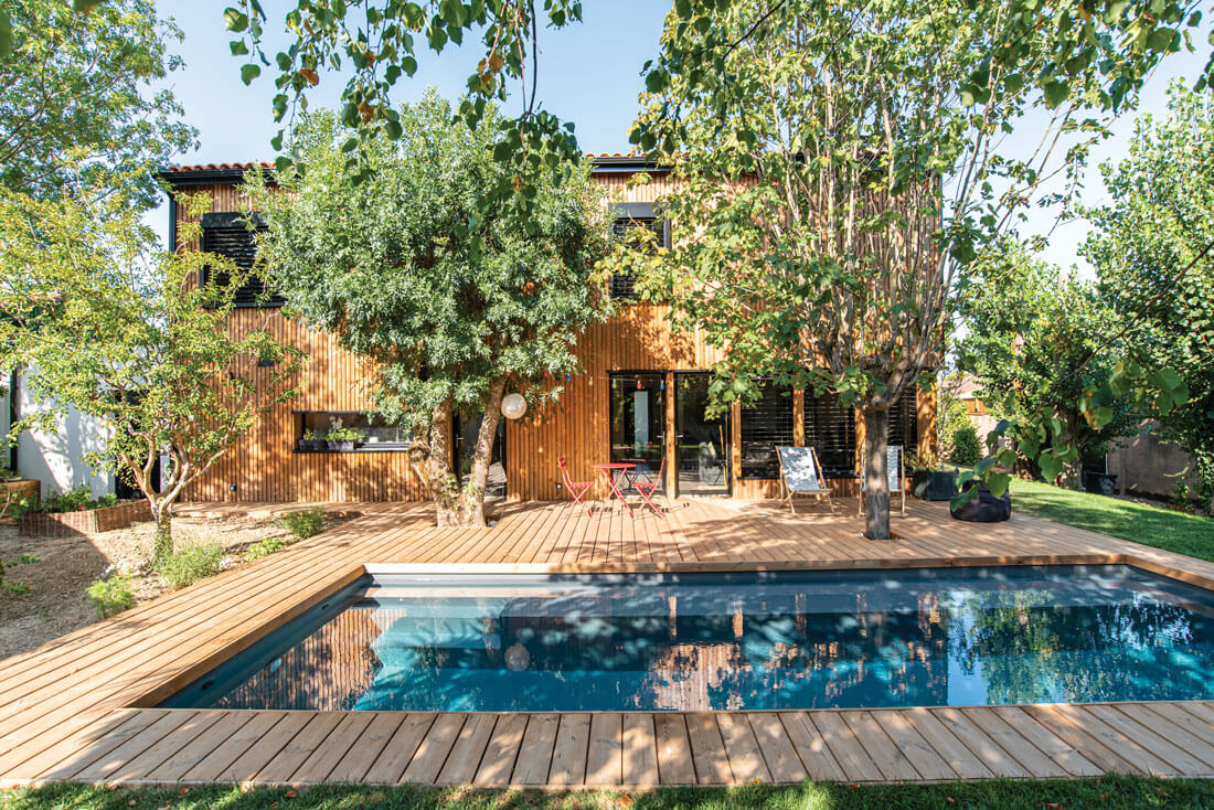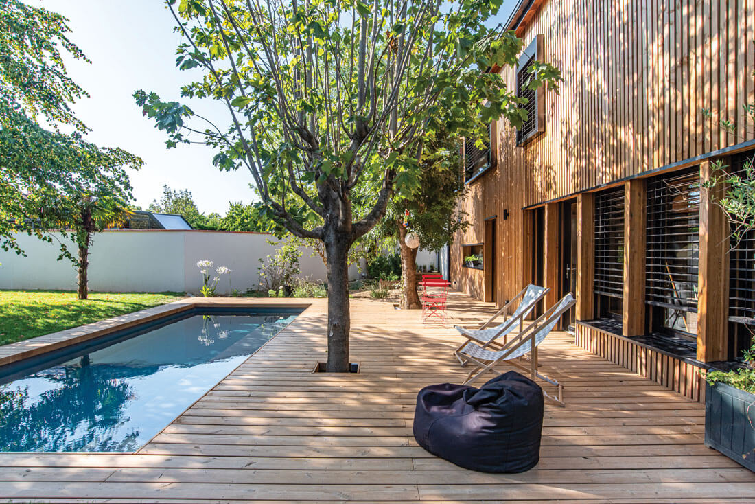 laurence roques architecte tournefeuilleCôté jardin. La terrasse est exclusivement constituée de pin classe 4. Les transats Alinéa, l’ensemble table et chaises rouge AM-PM et la piscine offrent l’embarras du choix à la famille pour profiter pleinement du jardin.