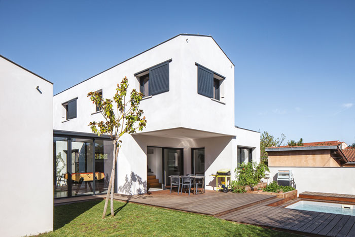 Jeu de volumes. Le volume en rez-de-chaussée, dédié à la vie de famille et aux parents, supporte le volume de l’étage réservé aux enfants. Un jardin avec piscine jouxte la maison de 150 m2. La terrasse en bois abritée et éclairée par des spots ainsi que le bassin offrent un large confort à la famille. Le volume destiné aux enfants, incarné par l’étage, se dévoile sous son meilleur jour.