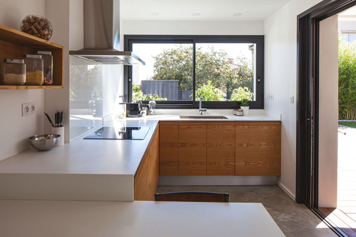 La cuisine offre une vue plongeante sur la piscine. Les façades des meubles en chêne plaqué se démarquent de la sobriété de la cuisine réalisée sur-mesure. Mobilier sans poignées. Le plan de travail en résine de Corian® se fond parfaitement dans la pièce, comme un prolongement des murs.