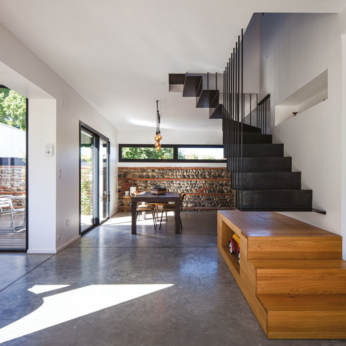 L’escalier se divise en deux parties, chêne massif et métal brut, qui contraste avec le sol en béton ciré. Notez l’absence de la première contremarche de l’escalier en métal plié au-dessus des marches en bois. Le caisson en bois fait également office de rangement.