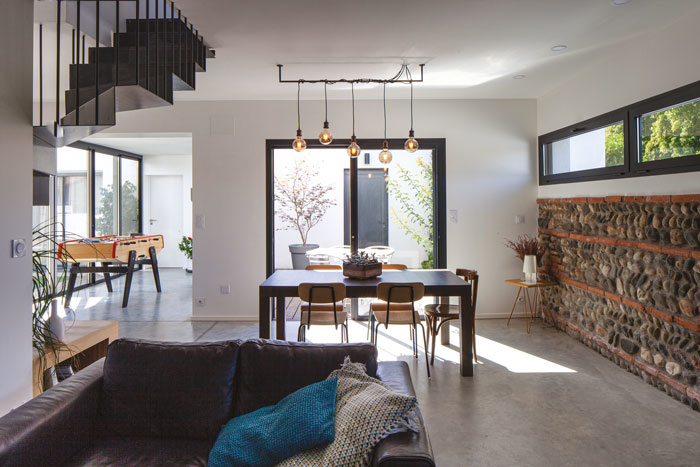 «La famille avait fait l’acquisition d’une parcelle sur laquelle subsistait un ancien mur en briques et galets. Le défi était d’intégrer cet élément tout en maximisant les rapports entre les futurs espaces intérieurs et le jardin »,explique l’architecte Gaël Angaud. Contacté par l’intermédiaire d’une connaissance, le Toulousain imagine une maison moderne et lumineuse aux côtés du couple de propriétaires. « La création d’autant de baies vitrées a été un véritable défi. Ils souhaitaient inonder les espaces de vie de lumière naturelle tout en respectant la réglementation thermique des habitations neuves. »