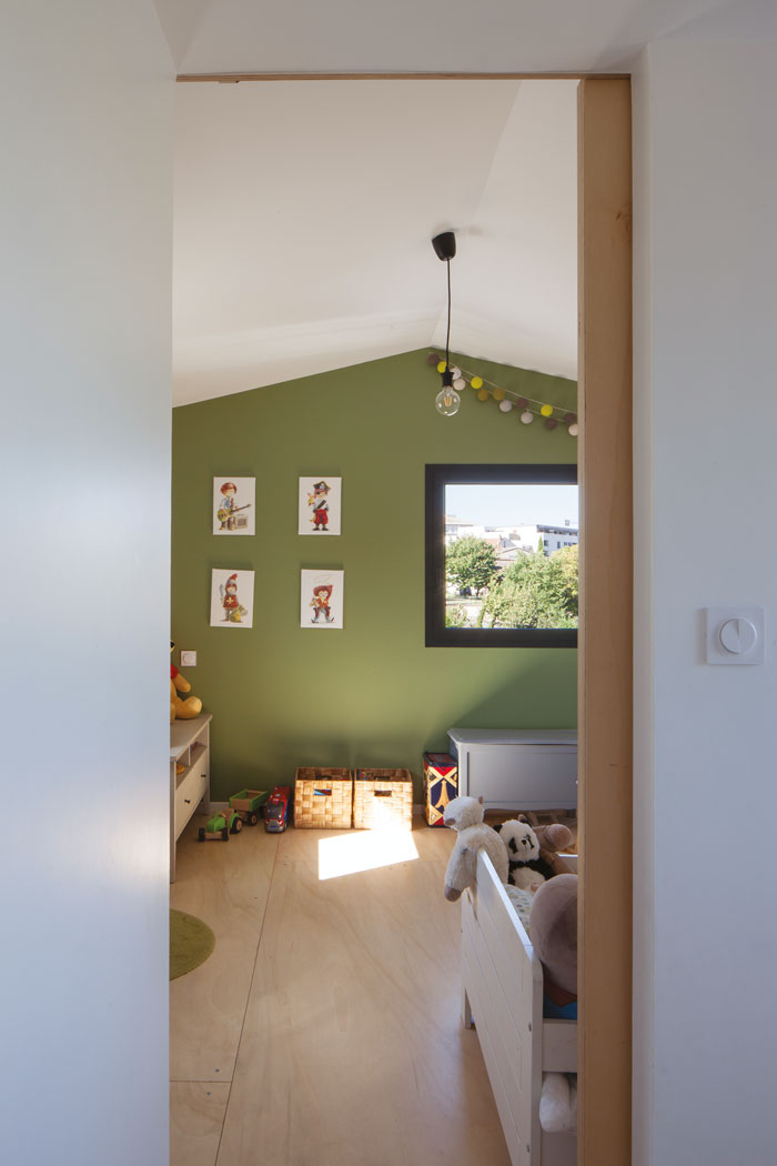 Les plaques de contreplaqué en bouleau vissées et le mur vert kaki confèrent une impression de jungle toujours tendance dans cette chambre d’enfant. La porte coulissante permet de minimiser la perte d’espace.