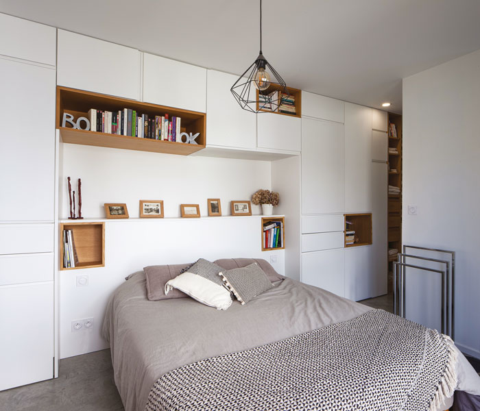 La pièce maîtresse de la chambre parentale est un meuble mural en médium laqué et bois de chêne dessiné sur-mesure. Idéal pour une tête de lit très pratique et ergonomique.
