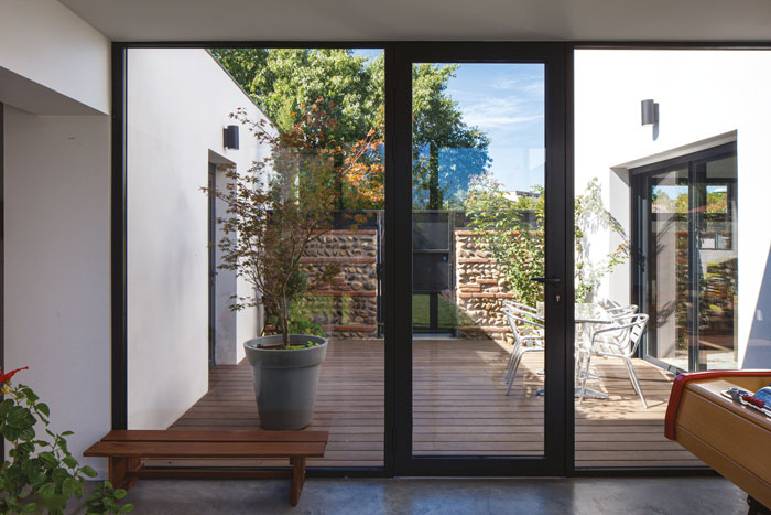 Le mur en briques et galets a été restauré pour pleinement se révéler dans cet environnement moderne. Ses lignes horizontales se retrouvent dans la forme panoramique des menuiseries placées au-dessus de lui.