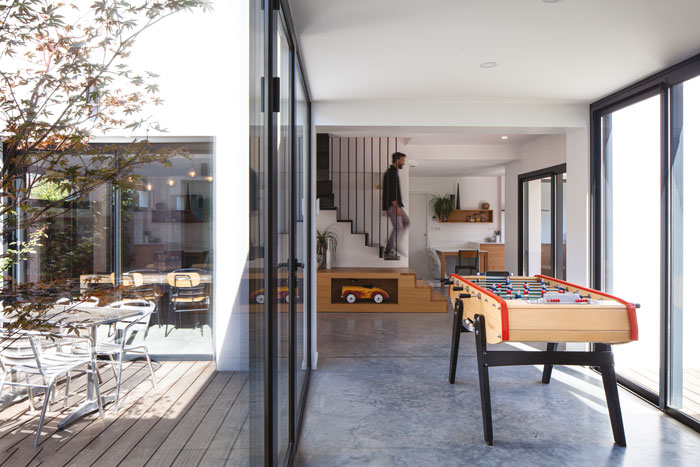 Une course en petite voiture ou un match de baby-foot ? L’espace qui accueille ce dernier fait office d’espace tampon entre l’habitation et le garage. Donnant également sur une terrasse côté rue et sur celle côté jardin, il contribue à inonder la maison de lumière.