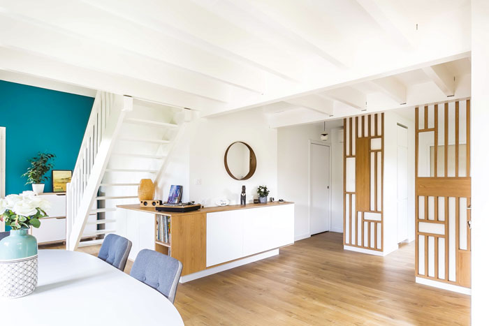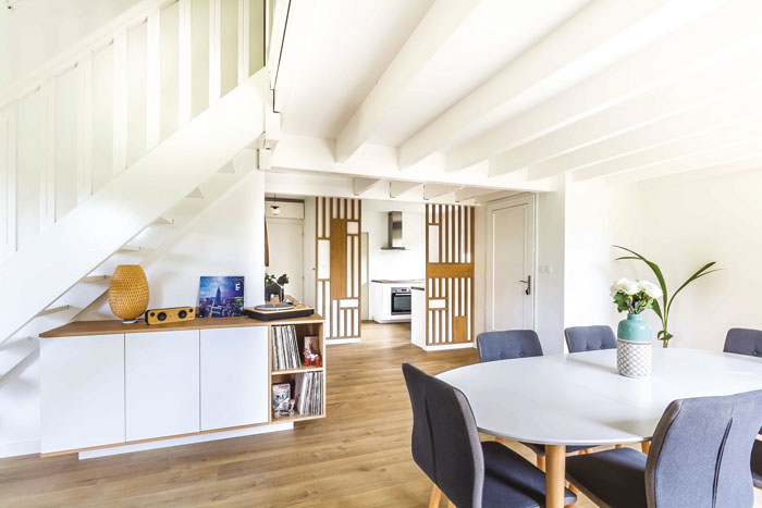Aussitôt les propositions d’Alessandra Melo validées, le chantier peut démarrer. « Nous avons supprimé une cheminée et des cloisons permettant ainsi la réorganisation des espaces entrée, cuisine et salle à manger. » Elle poursuit : « Un meuble sur-mesure a été créé et la cuisine a été aménagée selon le cahier des charges des clients ». L’architecte d’intérieur a imaginé deux claustras pour marquer l’entrée et servir de brise-vue avec l’espace cuisine. Le sol a été entièrement remplacé, les murs et les plafonds refaits et l’escalier repeint. Au-delà de la pièce à vivre, cette rénovation a également concerné la cuisine, l’entrée, le dégagement et le WC.