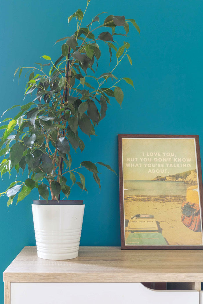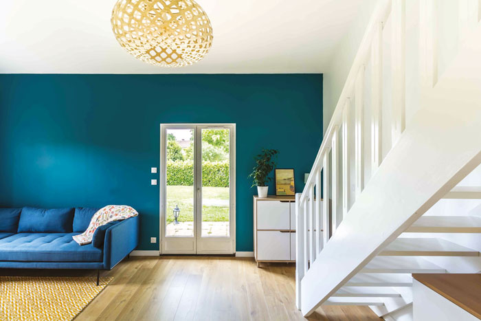 Le mur bleu Achen 0653 (nuancier Chromatic®) du salon permet de ramener de la couleur dans la pièce. Une couleur tendance, qui se marie très bien avec la teinte naturelle du bois (plancher, suspension, meubles...). Parquet stratifié en pose flottante.