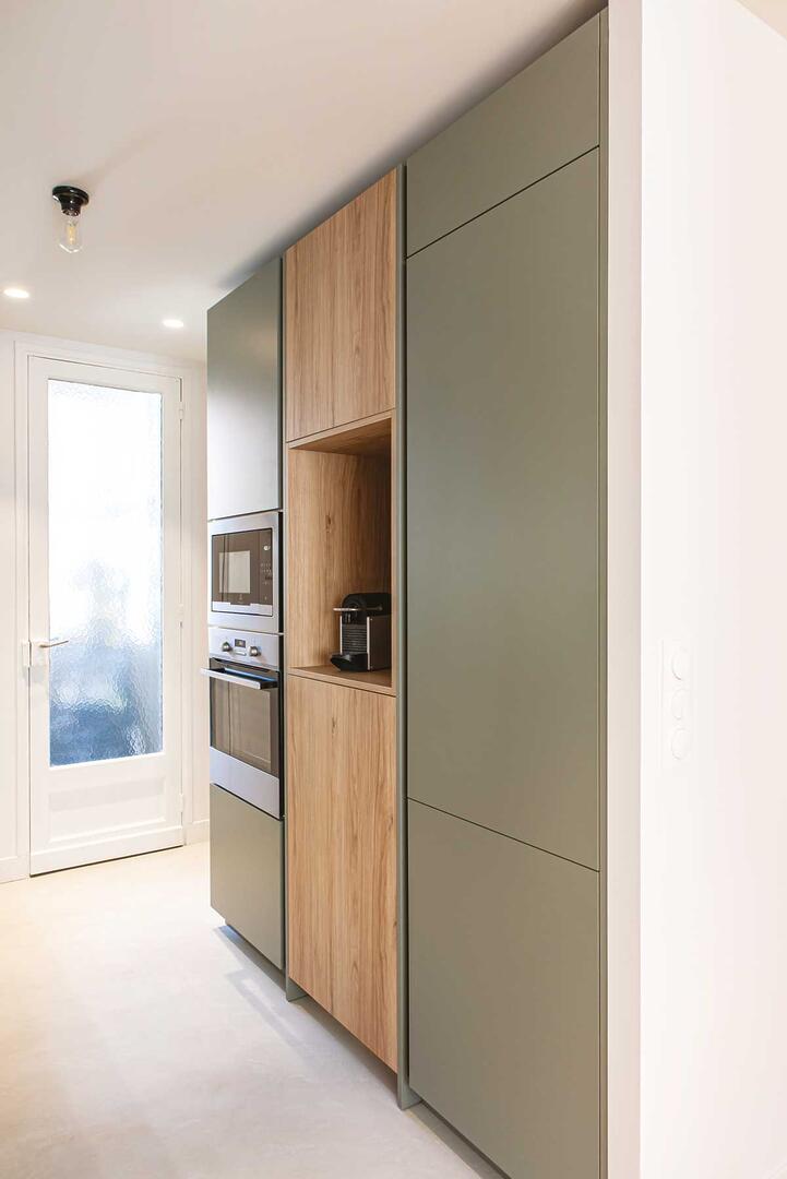 Cuisine refaite intégralement. Sa cloison avec la pièce à vivre abattue, elle gagne en lumière, espace et fonctionnalité. La cuisine est en stratifié vert grisé et imitation bois (marque Arrital). Le plan de travail en granit noir du Zimbabwe ne dépasse pas les 2 cm d’épaisseur. La crédence est en carrelage de la Matériauthèque de Catherine (Castanet-Tolosan). Au plafond, lampe en porcelaine noire tout à fait rétro (Zangra).