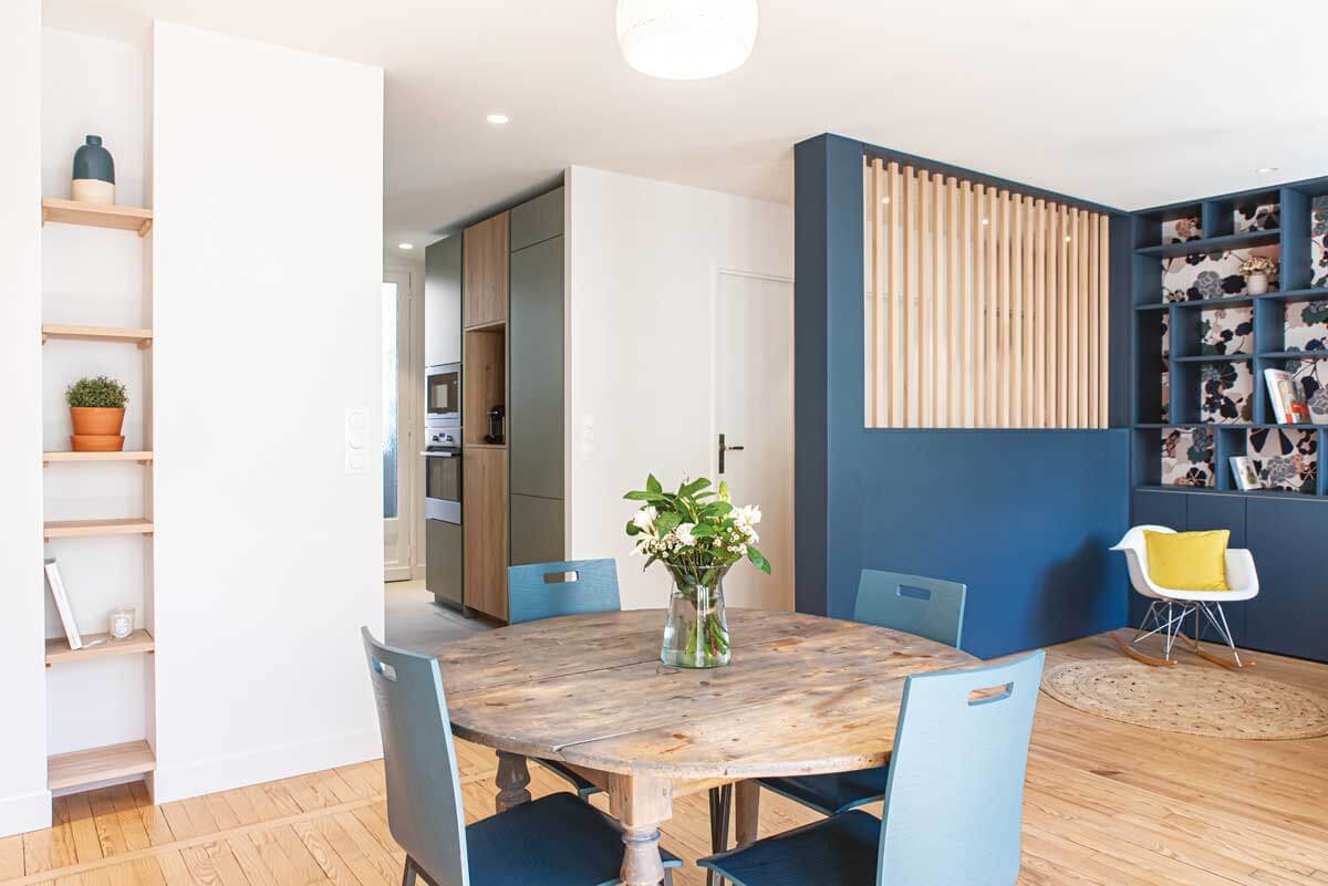 La cuisine, la pièce à vivre et l’entrée ont été totalement rénovées par l’architecte d’intérieur Maud Ledru. Auparavant, le wc donnait directement sur le salon. La claire-voie en hêtre isole à présent l’espace salon du wc. Ce meuble offre du