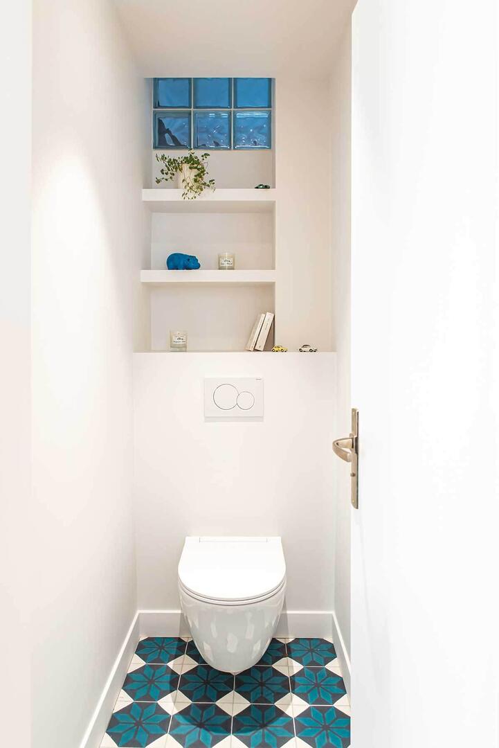 Après rénovation, le wc gagne en luminosité et rangements fonctionnels.