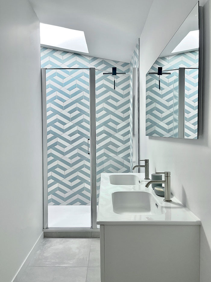 l’étage de la maison principale est réservé aux trois chambres avec salle de bains, pour recevoir les 3 enfants du couple. Quant au rez-de-chaussée de la maison principale, il est réservé au salon qu’une coursive longeant le patio central relie à l’extension. Cette dernière profite d’une terrasse couverte d’une pergola bioclimatique. Entre juillet 2024 et février 2025, mois de la livraison du chantier, tous les corps de métier ont œuvré à faire du rêve une réalité. Les propriétaires ont investi les lieux avec beaucoup de plaisir et n’ont pas manqué d’inviter l’agence d’architecture à la crémaillère.