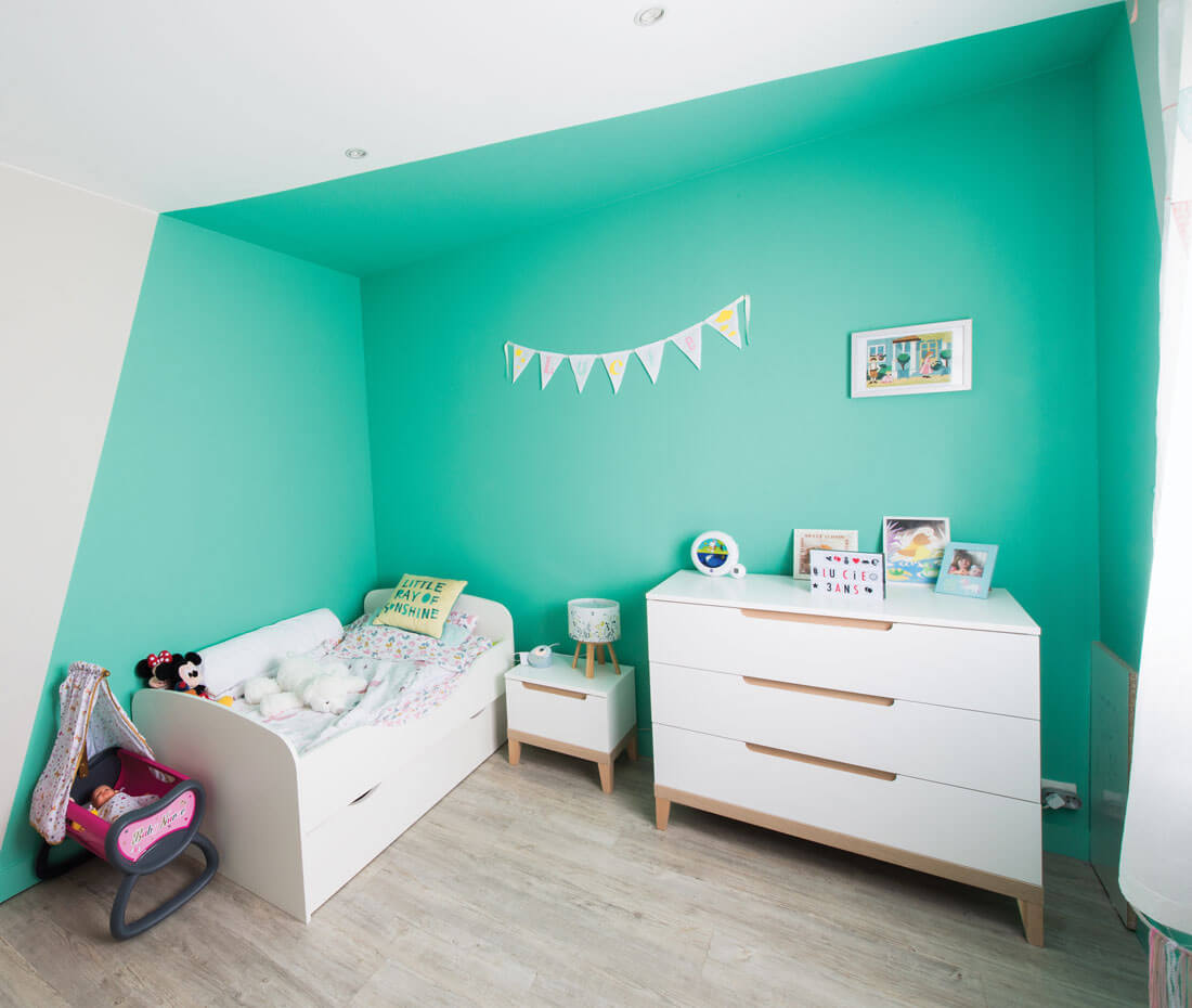 Chambre vert menthe n°92 de Little Greene. Un duo de blanc et de vert menthe de Little Greene offre à cette chambre d’enfant de la gaieté. Le mobilier provient du site « ma chambre d’enfant ».