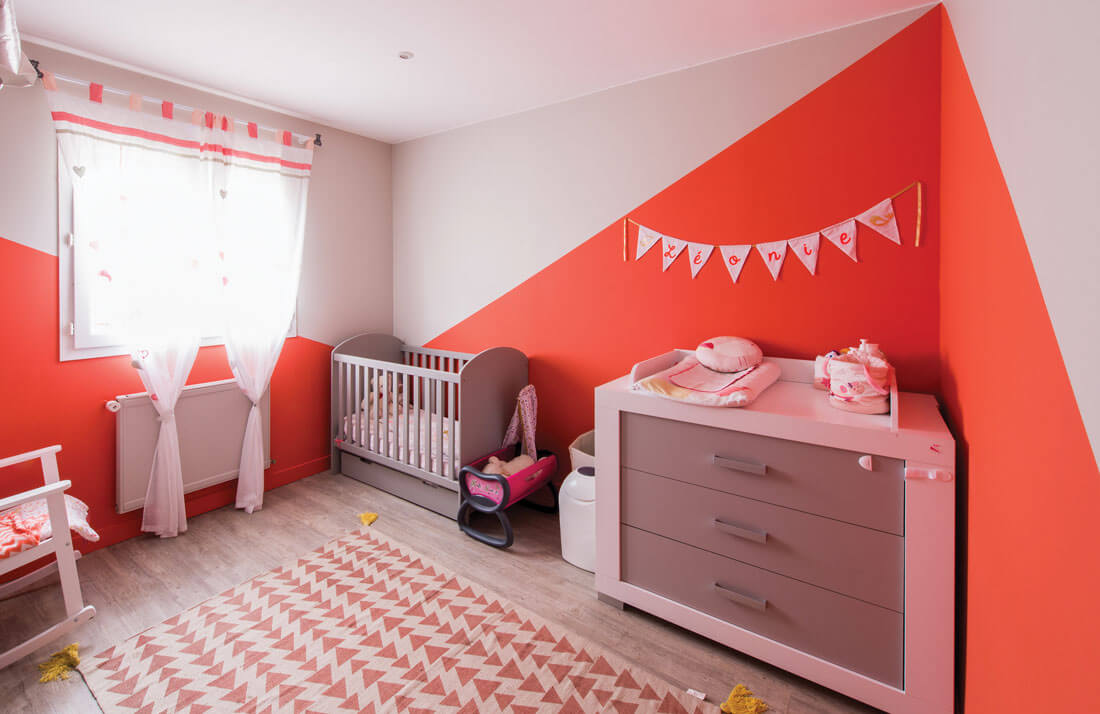 Chambre d’enfant orange éclatant. La peinture orange Aurora n°21 de Little Greene et le sol en lame LVT de chez Moduléo se combinent parfaitement dans cette chambre d’enfant. Le lit Verbaudet et la commode The wood factory se fondent facilement dans la pièce.