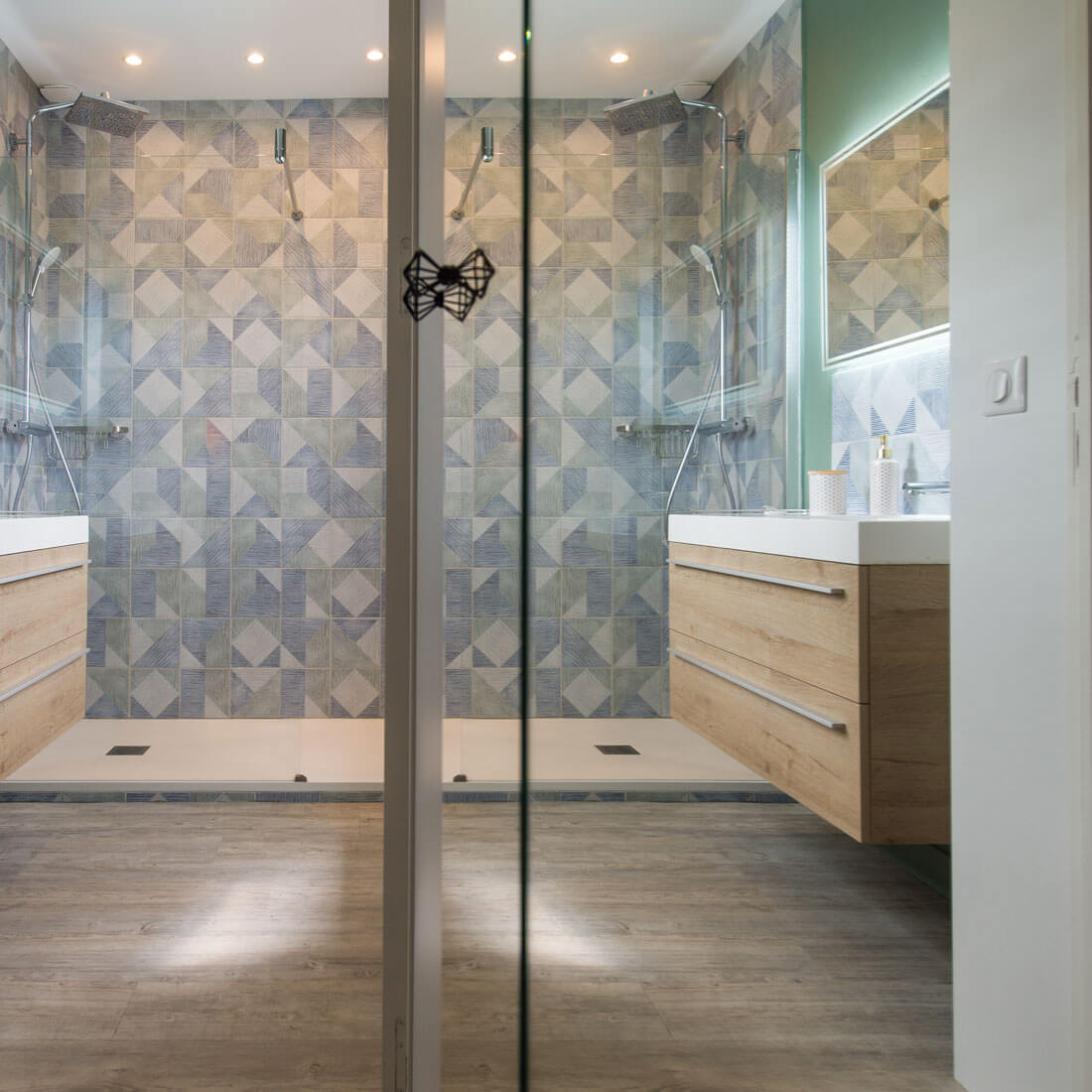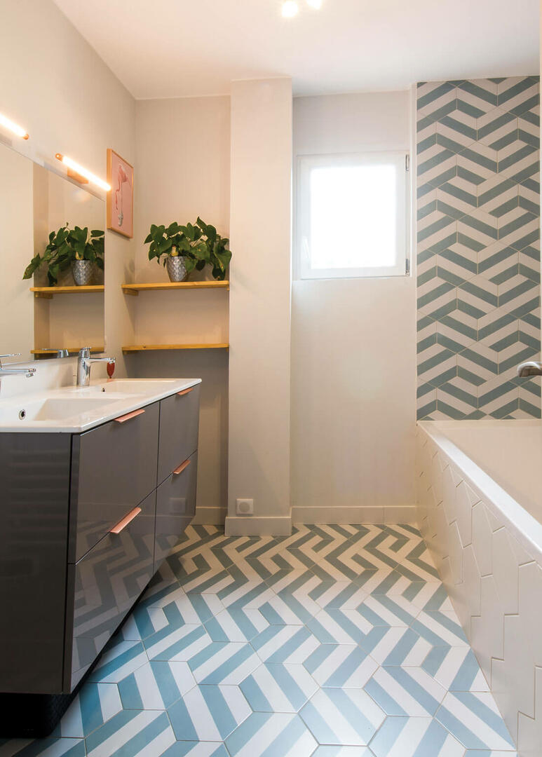 La salle de bains pour enfants est habillée de carrelage « Capri aqua » de chez Diffusion céramique. De chaque côté de la pièce se situent la baignoire « Prima style » et un meuble gris et cuivre de chez Leroy Merlin.